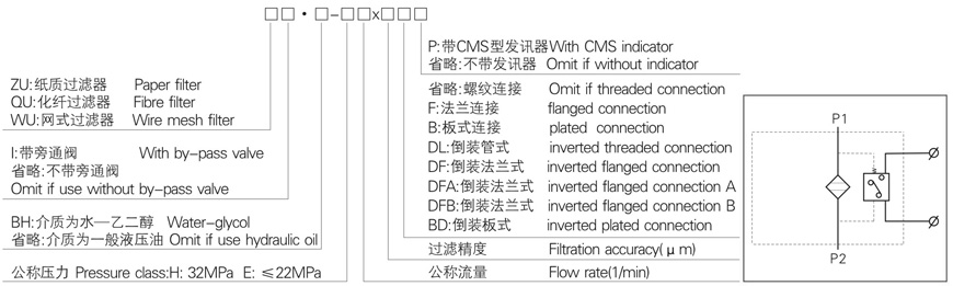 注:*為過濾精度,#為過濾材料,若使用介質為水—乙二醇,濾材為紙質,帶發(fā)訊器和旁通閥,則過濾器型號為:ZUI·BH—H63×*P,濾芯型號為HX·BH-63×*濾材為化纖,帶發(fā)訊器,則過濾器型號為:QU·BH-63×*P, 濾芯型號為:HX·BH-63×*Q,濾材為金屬網(wǎng),帶發(fā)訊器,則過濾型號為:WU-H63×*P,濾芯型號為:HX-63×*W