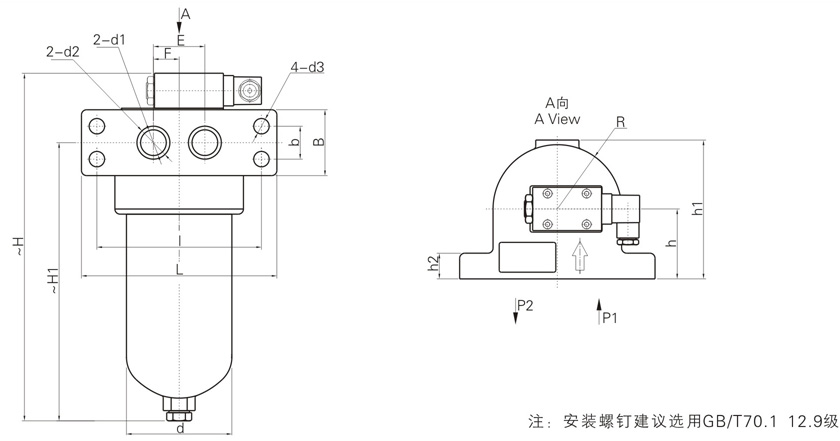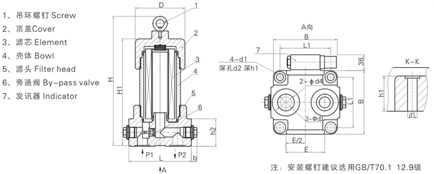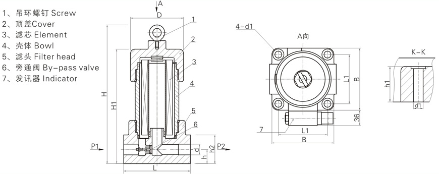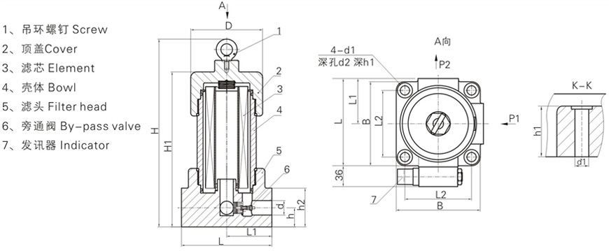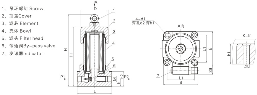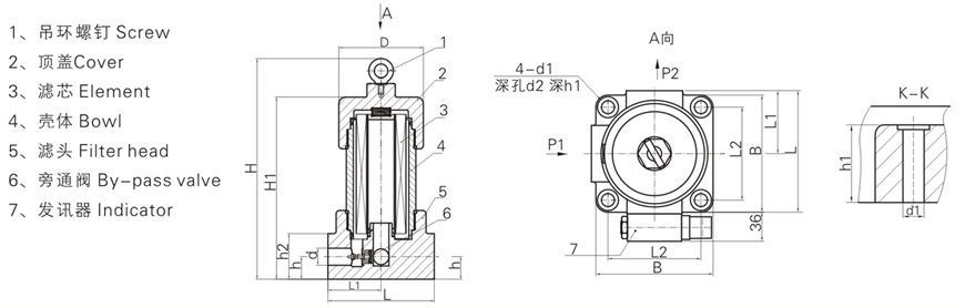 該過濾器設有壓差發(fā)訊裝置,當濾芯污染堵塞到進出油口壓差為0.35Mpa時,即發(fā)出開關信號,此時更換濾芯,以達到保護系統(tǒng)安全的目的。