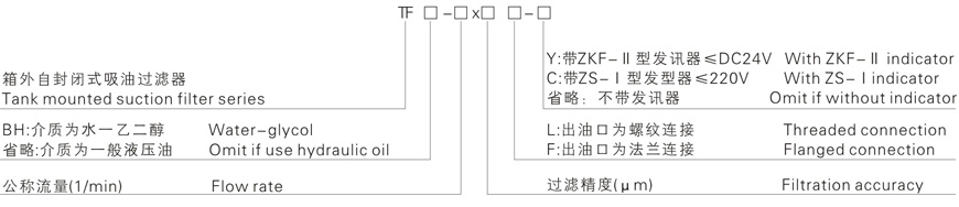 注:*為過濾精度,若使用介質(zhì)為水一乙二醇,公稱流量160L/min,過濾精度80μm,帶ZS-Ⅰ型發(fā)訊器,則過濾器型號為TF·BH-160x80L-C,濾芯型號為TFX·BH-160x80。