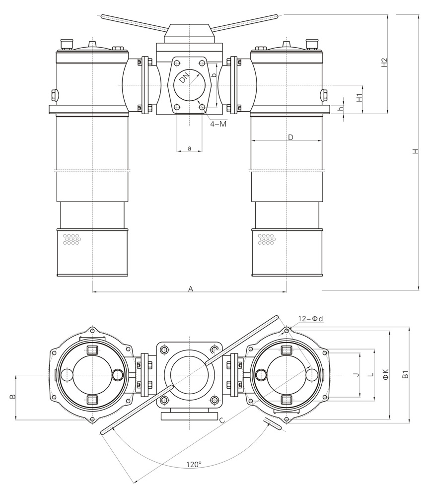 | DN | a | b | M | H1 | H2 | h | B | ΦK | J | L | B1 | d | A | D | H | C | Q | |
