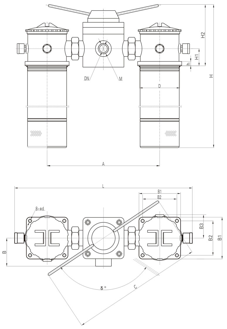 | DN | M | H1 | B | B1 | B2 | B3 | d | A | D | L | H | H2 | C | h | δ | |