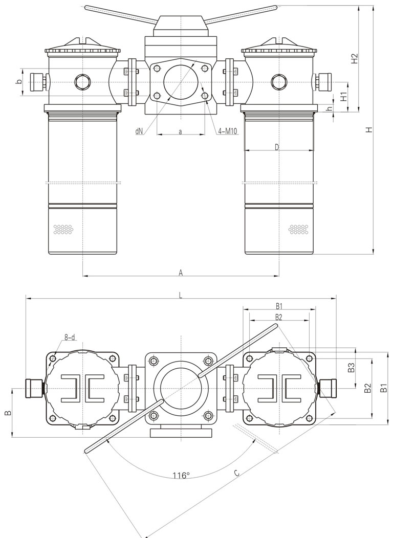 | DN | a | b | H1 | B | B1 | B2 | B3 | d | A | D | L | H | H2 | C | h | Q | |