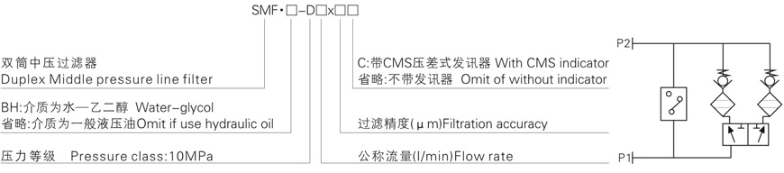 注:*為過濾精度,若使用介質(zhì)為水一乙二醇,使用壓力10MPa,公稱流量100L/min,過濾精度10μm,帶發(fā)訊器。則過器型號為SMF·BH-D100×1 0c。濾芯型號為LH0160D010BN3HC。